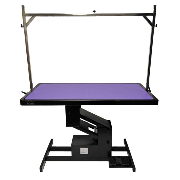 Available in Black, Pink, Purple and Blue table top.One of the tallest grooming tables on the market! The stable double axel frame is both table stable and powerful. This table lowers to an incredible 10″ and raises to 46″, making this table perfect for almost all breeds, especially larger or older pets. Supports weight of 120KG. The non-slip black table top is removable for easy cleaning. Comes complete with stainless steel grooming arm.