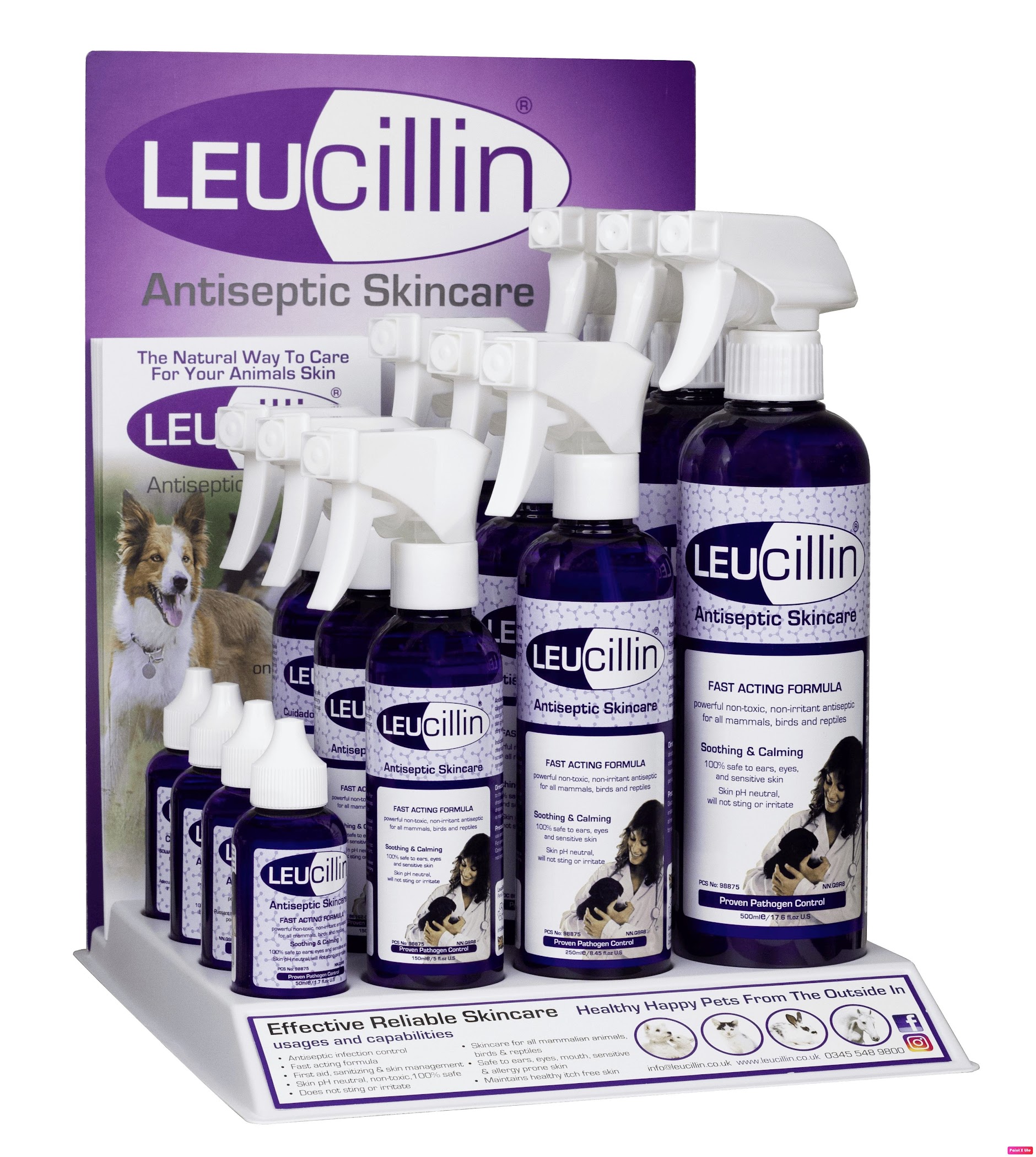 Leucillin starter kits are designed to help you start selling straight away, providing a selection of best-selling sizes from the 50ml dropper for eyes and ears to the 150ml, 250ml and 500ml sprays. So you can offer customers the right option for their needs. Combined with supporting brochures and POS materials, you can confidently explain how Leucillin is a fast-acting, non-toxic solution for common issues like itchy skin, tear staining and minor cuts. By using these tools and recommending it as an easy aftercare product, you can build trust with your clients while creating a strong and consistent retail opportunity in your salon.