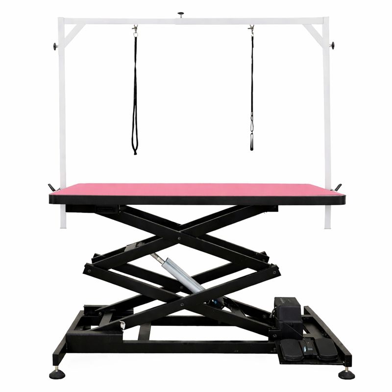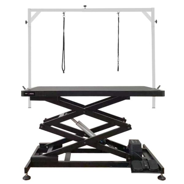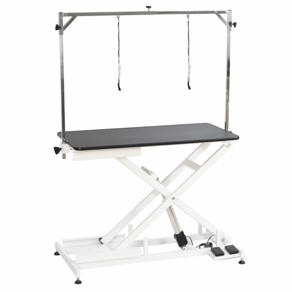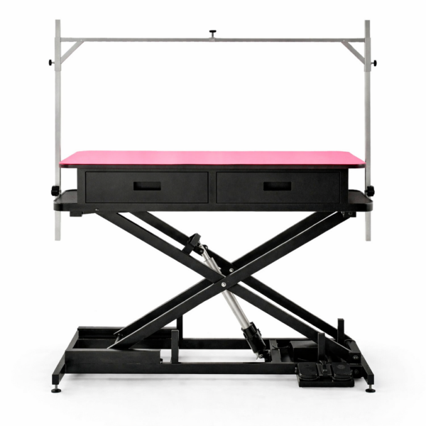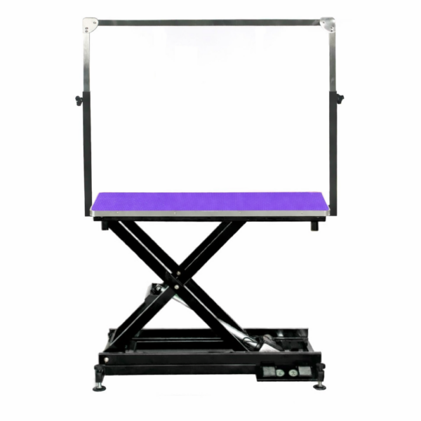 Available in Black, Pink, Purple and Blue table top.One of the tallest grooming tables on the market! The stable double axel frame is both table stable and powerful. This table lowers to an incredible 10″ and raises to 46″, making this table perfect for almost all breeds, especially larger or older pets. Supports weight of 125KG. The non-slip black table top is removable for easy cleaning. Comes complete with stainless steel grooming arm.*Phone number required at checkout.* Northern Ireland Surcharge is £50, one of our team will contact you after the order for paymentThere is a surcharge for Orkney Islands and remote areas , please contact us @ info@groomersworld.co.uk for quote.Remote area’s postcodes are as follows : KW | PH | IV | PA20 – PA40 | AB | DD | PO30 – PO41